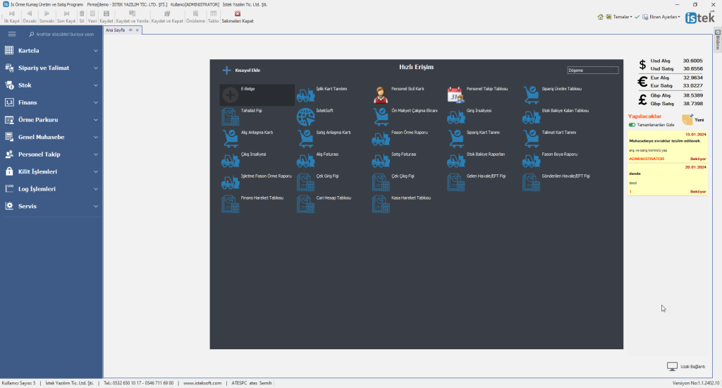 Bir işletmede üretim süreçlerini ön maliyetten, reel maliyete kadar en kolay şekilde takip edilmesini sağlar, kolay kullanım özelliğine sahip ve tüm e-dönüşüm süreçlerini (E-Fatura, E-Arşiv Fatura, E-İrsaliye, E-Defter) tek ekrandan canlı olarak takip edebilirsiniz.